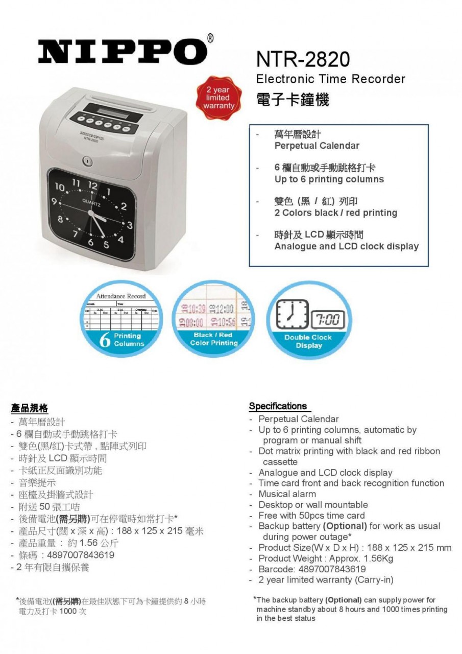 NIPPO NTR-2820卡鐘 萬年曆設計6 欄自動或手動跳格打卡雙色(黑/紅)卡式帶,點陣式列印時針及LCD 顯示時間卡紙正反面識別功能音樂提示座枱及掛牆式設計尺寸(闊 x 深 x 高) : 193 x 129 x 245 毫米重量 : 約 1.7 公斤- 2 年有限自攜保養 - 外殼及打印部份不在保用範圍內
